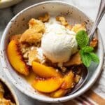 8. Cool and serve: Let the cobbler cool for 10 minutes before serving. Serve warm, topped with vanilla ice cream and garnished with fresh mint leaves if desired. Enjoy your cozy, homemade peach cobbler!