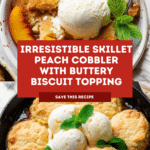 This Best-Ever Skillet Peach Cobbler features tender, juicy peaches cooked to perfection in a cast-iron skillet with a rich buttery sauce, topped with a golden, slightly sweet biscuit topping made with cornmeal and buttermilk. Baked until bubbly and golden, this comforting dessert is perfect served warm with vanilla ice cream and fresh mint for a delightful finish.