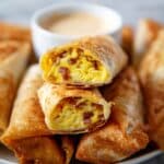 These Breakfast Egg Rolls are a delicious and crispy twist on traditional breakfast, filled with fluffy eggs, savory bacon, and melted cheddar cheese, all wrapped in a crunchy egg roll wrapper and perfectly cooked in the air fryer. A quick and easy breakfast or brunch option served with optional sausage gravy for dipping.