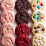 Four rows of cookies are laid out neatly on a white marbled surface, arranged in four vertical columns. The first column shows soft pink cookies with a cracked texture, three in a row. The second column has three dark brown chocolate cookies, smooth but cracked on top. The third column features three light cream-colored cookies with colorful candy pieces in red, blue, green, and orange. The last column has three red velvet cookies topped with white chocolate chips, each cookie showing a cracked surface. photo taken with an iphone --ar 4:5 --v 7