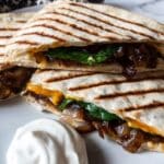 This Caramelized Onion and Mushroom Quesadilla is a flavorful vegetarian dish combining sweet caramelized onions, tender sautéed mushrooms, melted sharp cheddar cheese, and fresh spinach and arugula, all sandwiched between perfectly toasted flour tortillas. Finished with a tangy lemon sour cream, it’s an easy yet sophisticated meal perfect for lunch or dinner.