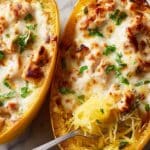 A comforting and delicious Chicken Alfredo Spaghetti Squash recipe that combines tender roasted spaghetti squash with juicy chicken breasts and a rich, creamy Alfredo sauce. Topped with melted mozzarella and fresh parsley, this low-carb twist on a classic pasta dish is perfect for a satisfying weeknight dinner.