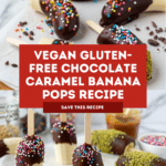Delicious and easy-to-make vegan and gluten-free Chocolate Caramel Banana Pops featuring frozen bananas coated in a smooth peanut butter caramel and rich dark chocolate, finished with your choice of sprinkles or nuts. Perfect for a healthy dessert or snack!
