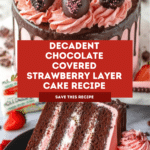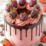 This decadent Chocolate Covered Strawberry Layer Cake is a show-stopping dessert featuring moist chocolate cake layers filled and frosted with strawberry-infused buttercream and luscious chocolate ganache. Layers of fresh diced strawberries and chocolate-covered strawberries on top add delightful freshness and elegance, making it perfect for special occasions or a sophisticated treat.