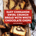 This Cinnamon Swirl Crunch Quick Bread is a delightful treat with a tender crumb and a sweet cinnamon sugar swirl. Topped with a buttery, crunchy topping and studded with white chocolate, it’s perfect for breakfast or an afternoon snack.