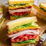 Keywords: club sandwich, sourdough, bacon, turkey, ham, cheddar cheese, classic sandwich, layered sandwich