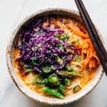 - Serve and Garnish: Serve the coconut curry noodle bowls hot, topped with shredded purple cabbage and a sprinkle of sesame seeds. Garnish with a squeeze of fresh lime and a handful of fresh basil leaves for brightness and extra flavor.