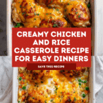 This comforting Chicken and Rice Casserole combines tender chicken thighs, long-grain white rice, and a medley of frozen mixed vegetables all baked in a creamy, savory sauce topped with melted cheddar cheese. Perfect for an easy weeknight dinner, it’s flavorful, hearty, and comes together with simple ingredients and straightforward steps.
