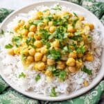 - Serve: Remove the skillet from heat. Serve the chickpea curry hot over cooked white rice and garnish generously with chopped cilantro for a fresh finish.