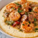 Store leftover shrimp and grits in an airtight container in the refrigerator for up to 3 days. Reheat gently on the stovetop or microwave, adding a splash of water or broth to loosen the grits if they thicken. The shrimp gravy reheats best over low heat to avoid toughening the shrimp.