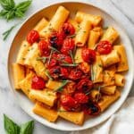 Keywords: vegan pasta, creamy red pepper sauce, blistered tomatoes, rigatoni recipe, plant-based dinner, easy vegan meal