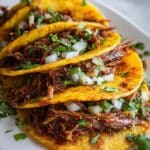 - Assemble Tacos: Fill each fried tortilla with a generous amount of shredded birria beef. Garnish with chopped fresh cilantro and diced onion. Serve immediately while warm.