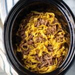 - Shred the Beef and Add Noodles: Remove the cooked beef from the crockpot and shred it using two forks. Return the shredded beef to the crockpot and stir into the broth. Add the dried egg noodles and stir to combine evenly. Dot the top with pats of butter to add richness as the noodles cook.