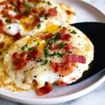 - Step 8: Sprinkle the crispy bacon pieces evenly over the eggs.