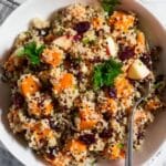 This Fall Harvest Quinoa Salad combines roasted butternut squash, fresh apple, pecans, dried cranberries, and parmesan cheese with a tangy maple-lemon dressing. It’s a colorful, nutrient-packed dish perfect as a light lunch or side salad during the autumn season, highlighting seasonal flavors and hearty textures.