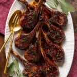 A white ridged oval plate holds a pile of eight grilled lamb chops, each with a dark brown, glossy glaze. The lamb chops are arranged with the bone handles fanned out, overlapping in some places, and sprinkled with small green herb pieces. A large gold-colored serving spoon with a slotted edge is placed on the left side of the plate under several chops. The plate sits on a dark wooden surface with fresh sage leaves and a pink textured cloth nearby. The glaze on the lamb chops looks slightly sticky and shiny, with some crisp browned edges. Photo taken with an iphone --ar 4:5 --v 7