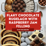 Flaky, buttery chocolate rugelach filled with tangy raspberry jam is a delightful treat perfect for any occasion. These crescent-shaped pastries offer a perfect balance of rich chocolate, sweet jam, and a hint of cinnamon spice.