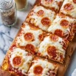 Keywords: French Bread Pizza, quick pizza recipe, easy dinner, homemade pizza, baked pizza, pepperoni pizza, cheesy bread