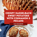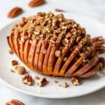 Keywords: Hasselback sweet potatoes, baked sweet potatoes, cinnamon brown sugar glaze, pecan topping, easy side dish, fall recipes, holiday side
