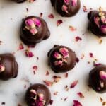 These Healthy Dark Chocolate Nut and Date Rose Truffles are a deliciously nutritious treat blending the rich flavors of dark chocolate, nuts, and dates with a hint of warm cinnamon and delicate rosebud decoration. Perfectly balanced with natural sweetness and packed with wholesome ingredients, these truffles are ideal for a guilt-free indulgence or elegant gift.