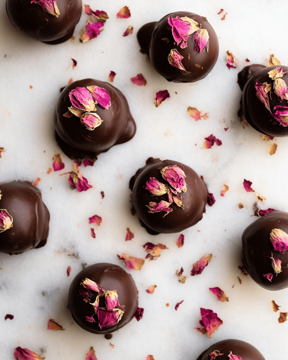 5. Coat the Truffles: Using a fork, dip each chilled truffle ball into the melted chocolate, allowing the excess to drip off. Quickly sprinkle with dried rosebuds before the chocolate sets. Repeat this process for all truffles.