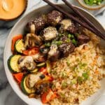 4. Build bowls & serve: Divide the cooked steak and sautéed vegetables evenly into shallow bowls alongside fried rice. Drizzle each bowl with store-bought Yum Yum sauce or serve the sauce on the side. Enjoy your flavorful hibachi steak bowls!