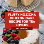 This delicate and airy Hojicha Chiffon Cake combines the rich, smoky notes of hojicha tea with a light and fluffy texture. Perfect for tea time or as a sophisticated dessert, this Japanese-inspired chiffon cake is flavored with roasted green tea leaves and topped with fresh cream and fruit for a delightful treat.