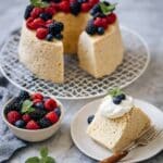A lightly textured, round chiffon cake with a soft beige color is displayed on a white wire cooling rack. The top of the cake is decorated with a neat row of fresh berries including red raspberries, dark blackberries, and deep blue blueberries, along with a few small green mint leaves. A single slice is served on a white plate nearby, showing the airy interior of the cake. Next to the slice on the plate, there is a dollop of white cream topped with two blueberries, one raspberry, and a small mint leaf. A fork with a wooden handle rests on the plate. Beside it is a small white bowl filled with the same mix of fresh berries and mint. The setting is on a white marbled surface. photo taken with an iphone --ar 4:5 --v 7