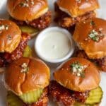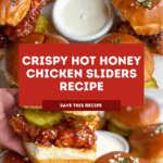 Keywords: hot honey chicken sliders, spicy chicken sliders, fried chicken sandwiches, party sliders, sweet heat pickles, homemade ranch dipping sauce