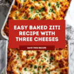 This classic baked ziti recipe features perfectly cooked penne pasta tossed in a rich marinara sauce, layered with creamy ricotta, shredded mozzarella, and Parmesan cheese, then baked to bubbly, golden perfection. A comforting Italian-American favorite that’s easy to prepare and perfect for family dinners.