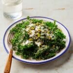 - Plate and garnish: Transfer the dressed kale to serving plates. Sprinkle the toasted chopped pistachios, toasted breadcrumbs, and grated Pecorino cheese evenly over the top of the salad.