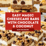 These Magic Cheesecake Bars combine a buttery graham cracker crust with a smooth, creamy cheesecake filling and a delightful topping of chocolate chips, coconut, and walnuts. They are easy to make and perfect for a special treat or a casual dessert.