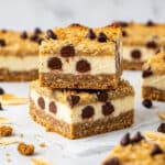 Keywords: cheesecake bars, graham cracker crust, chocolate chip cheesecake, coconut walnut topping, baked dessert