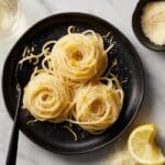 - Finish and Serve: Drizzle the fresh lemon juice over the pasta and season generously with freshly ground black pepper. Top the dish with the reserved lemon peel strips for an aromatic and decorative finish. Serve immediately.
