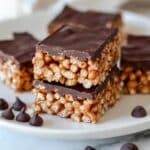 - Set and Cut: Allow the treats to cool at room temperature or place in the refrigerator until the chocolate topping is firm. Use the foil overhang to lift the dessert out of the pan easily. Cut into squares and serve.