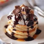 These Peanut Butter Cup Pancakes are a decadent twist on a classic breakfast favorite, combining fluffy pancakes with creamy peanut butter and chopped mini chocolate peanut butter cups. Topped with whipped cream and chocolate syrup, they make a delightfully indulgent treat perfect for weekend mornings or special occasions.