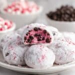 A white plate filled with round cookies covered in a thick layer of white powdered sugar mixed with small pink bits, with one cookie cut in half and placed on top, showing a bright pink interior packed with many small dark chocolate chips. The plate is set on a white marbled texture surface, and blurred in the background are two white bowls, one filled with pink and white peppermint candies and the other with dark chocolate chips. Photo taken with an iphone --ar 4:5 --v 7