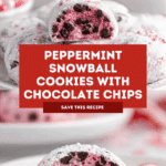 Keywords: peppermint snowball cookies, holiday cookies, chocolate chip peppermint cookies, Christmas cookies, festive desserts