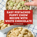 Keywords: Pistachio Puppy Chow, Puppy Chow, Chex Mix Recipe, Pistachio Snack Mix, White Chocolate Puppy Chow, No-Bake Snack