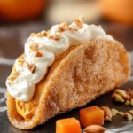 These Pumpkin Pie Tacos are a delightful fall-inspired dessert featuring crispy, cinnamon-sugar coated tortilla shells filled with a creamy pumpkin pie filling and topped with homemade whipped cream and chopped pecans. Perfect for holiday gatherings or a festive treat, these tacos combine the flavors of traditional pumpkin pie with a fun and crunchy twist.