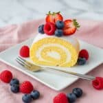 - Final roll and serve: Roll the cake back up as tightly as possible without squeezing out the filling. Trim the ends evenly. Dust the cake roll with sifted powdered sugar, transfer it to a serving platter, and slice into thick pieces. Serve immediately with fresh macerated berries or refrigerate covered with plastic wrap until serving. Before serving, dust again with powdered sugar.