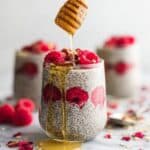 A clear glass filled with three layers of light gray chia pudding mixed with small black seeds and bright red raspberries scattered inside each layer. The pudding reaches near the top of the glass, where a few fresh raspberries sit on the surface. Golden honey is being drizzled from a honey dipper above, coating the raspberries and dripping down the sides, with some honey pooled on the white marbled surface around the glass. In the blurred background, there are more similar glasses and scattered red raspberries. Photo taken with an iphone --ar 4:5 --v 7