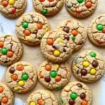 Keywords: Reese’s Pieces cookies, peanut butter cookies, chewy cookies, peanut butter chips, candy cookies, easy cookie recipe