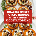 These Roasted Sweet Potato Rounds topped with creamy herbed ricotta, crunchy walnuts, and sweet dried cranberries make a delightful and elegant appetizer or side dish. The natural sweetness of the roasted potatoes pairs beautifully with the savory herbs, earthy nuts, and tangy cranberries, offering a harmonious blend of flavors and textures that are simple to prepare and sure to impress.