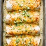 Keywords: smothered burrito, green chile sauce, baked burrito, chicken burrito, Mexican dinner, creamy green chile, cheesy burrito