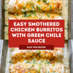 This Smothered Burrito with Green Chile Sauce is a hearty, flavorful Mexican-inspired dish featuring tender chicken mixed with salsa and spices, wrapped in warm flour tortillas, baked until golden and crispy, then topped with a creamy, tangy green chile sauce and melted cheddar cheese. Perfect for a comforting dinner that combines bold spices and rich textures.