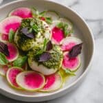 - Assemble the dish: Spoon several generous dollops of the green goddess pesto onto the serving platter or bowl. Place the burrata cheese on top of the pesto. Drizzle additional pesto over the burrata. Arrange the thinly sliced watermelon and red radishes around the burrata evenly. Sprinkle with microgreens for a fresh, vibrant garnish.