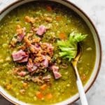 This hearty and comforting Stovetop Split Pea Soup with Ham features tender green split peas simmered with fragrant vegetables, fresh herbs, and savory ham shank for rich flavor. Perfect for a cozy meal, this soup develops deep taste after slow simmering and is finished with a touch of vinegar and Worcestershire sauce to brighten the flavors.
