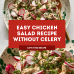 A fresh and flavorful chicken salad without celery, featuring shredded rotisserie-style chicken, crunchy radishes, and a tangy dijon-mayo dressing with a hint of honey and lemon. This easy-to-make recipe is perfect for a quick lunch or light dinner, combining creamy textures and vibrant colors for a satisfying salad experience.
