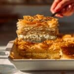 Tiropita, or Greek cheese pie, is a deliciously flaky pastry filled with a creamy blend of feta and ricotta cheeses. This savory treat is perfect for a snack, appetizer, or light meal and pairs wonderfully with a drizzle of honey for a hint of sweetness.